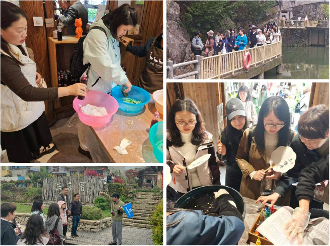 在三落厝研学工坊,教职工们在非遗传承人指导下体验植物染布,从捆扎、浸染到漂洗,亲手完成蓝染作品。团扇绘制环节,大家以春日为题,挥毫描绘春花彩蝶。实践间隙,导览员还带领大家辨识本地特色植物,将自然知识融入研学之中。