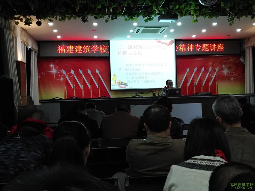 11月25日下午,福建建筑学校举行十八届六中全会精神宣讲报告会。省委党史研究室原副主任、正厅级巡视员、研究员、国务院特殊津贴专家、省直机关党工委讲师团特聘教授林强同志作专题报告。报告会由党委书记林启豫同志主持,全校教职工近200人参加了报告会。