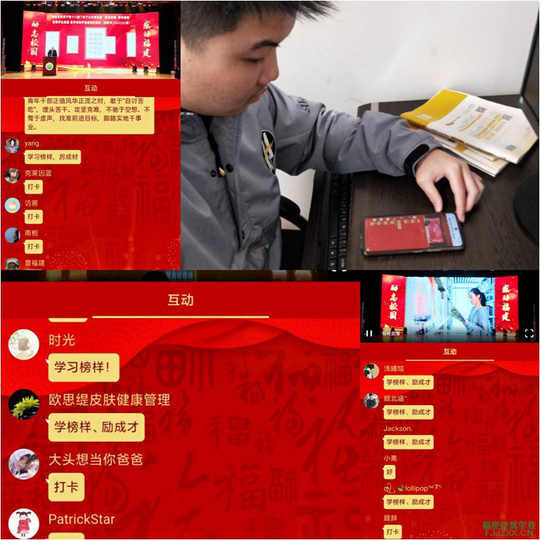 为宣传国家资助政策成效,提升资助育人实效,弘扬励志先锋先进事迹,1月10日下午15:00我校组织各班学生收看福建省第四届“励志校园•感动福建”优秀学生典型宣传活动直播。