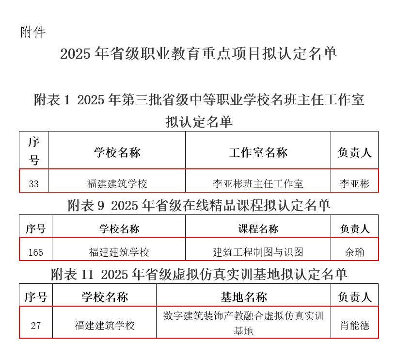 喜报丨祝贺福建建筑学校三个项目入选2025年省级职业教育重点项目拟认定名单
