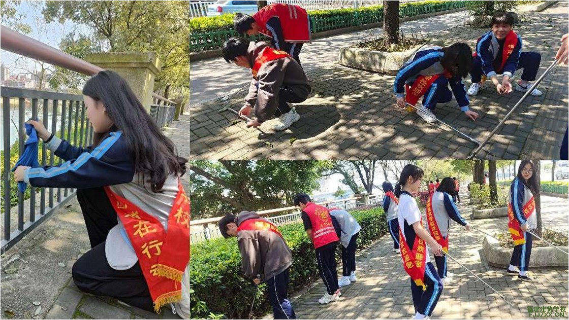 3月11日,我校2016班、2017班学生志愿者在团委教师黄爱爱、徐志伟带领下,对闽江河畔人行步道周边的环境卫生进行了整治。志愿小组充分发挥党团先锋作用,合力清扫了路边的树叶和纸屑,清洁了围栏,发扬不怕苦、不怕累、不怕脏精神,以实际行动书写新时代雷锋故事,争做爱劳动的青年志愿“螺丝钉”。