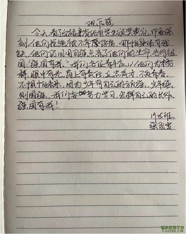 学榜样,励成才!观看直播后,同学们深受触动,纷纷表示他们是时代的先锋,是战斗的旗手,是青年的楷模,是成功的典范。作为感动福建杰出青年,他们积极展示专长,但更乐于发挥集体智慧;他们强调个人成就,但更重视团队荣誉。我们应学榜样,争做新时代好少年,在三年的中职生活中,励志奋斗,勤勤恳恳,创造属于自己的那一抹青春色彩!