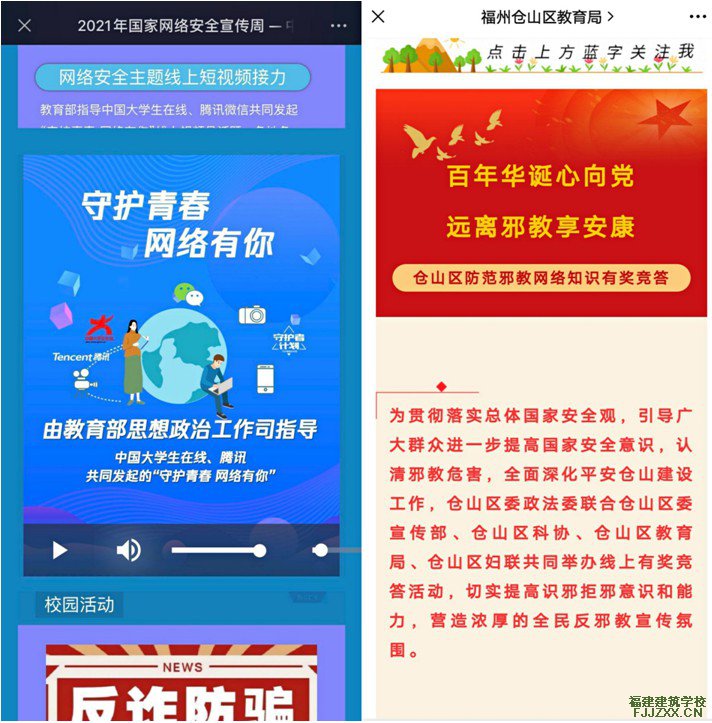 为进一步提升学生的网络安全防护意识、防护技能,营造健康文明的校园网络环境,10月11日-10月17日福建建筑学校开展“网络安全为人民,网络安全靠人民”为主题的国家网络安全宣传周系列活动。