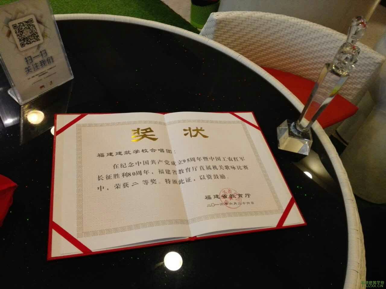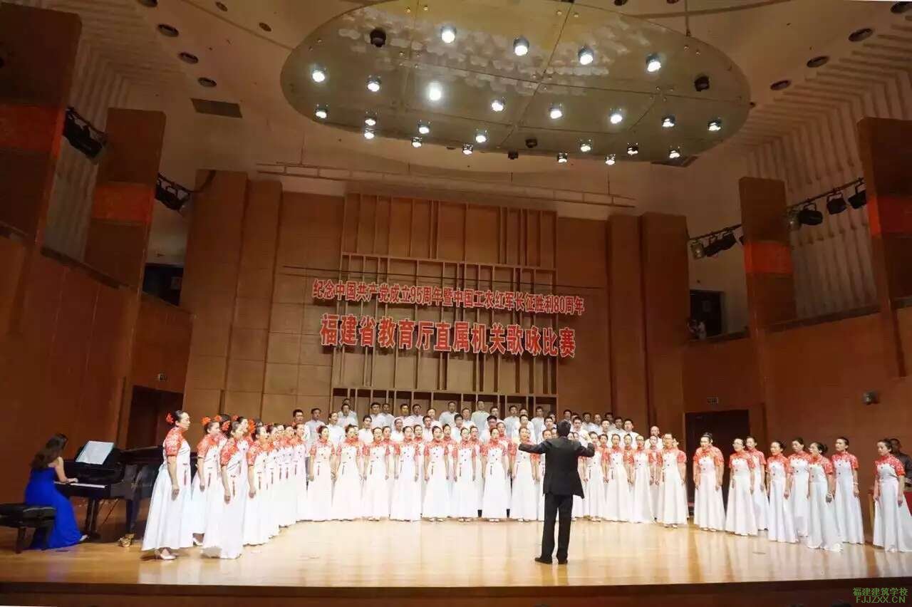 为庆祝中国共产党建党95周年和红军长征胜利80周年,大力宣传党的光辉历史和光荣传统,歌颂党领导全国人民进行革命建设和改革开放的伟大成就,2016年6月26日,福建省教育厅在福建大剧院音乐厅隆重举行庆祝建党95周年暨红军长征胜利80周年歌咏比赛。福建建筑学校合唱团演唱的歌曲《龙的传人》在此次比赛中取得了优秀成绩,荣获大赛二等奖。他们个个全情投入,将一首经典老歌用一种全新的方式演绎得荡气回肠,赢得全场热烈掌声,向全体观众充分展现了福建建筑校人的精神风貌。