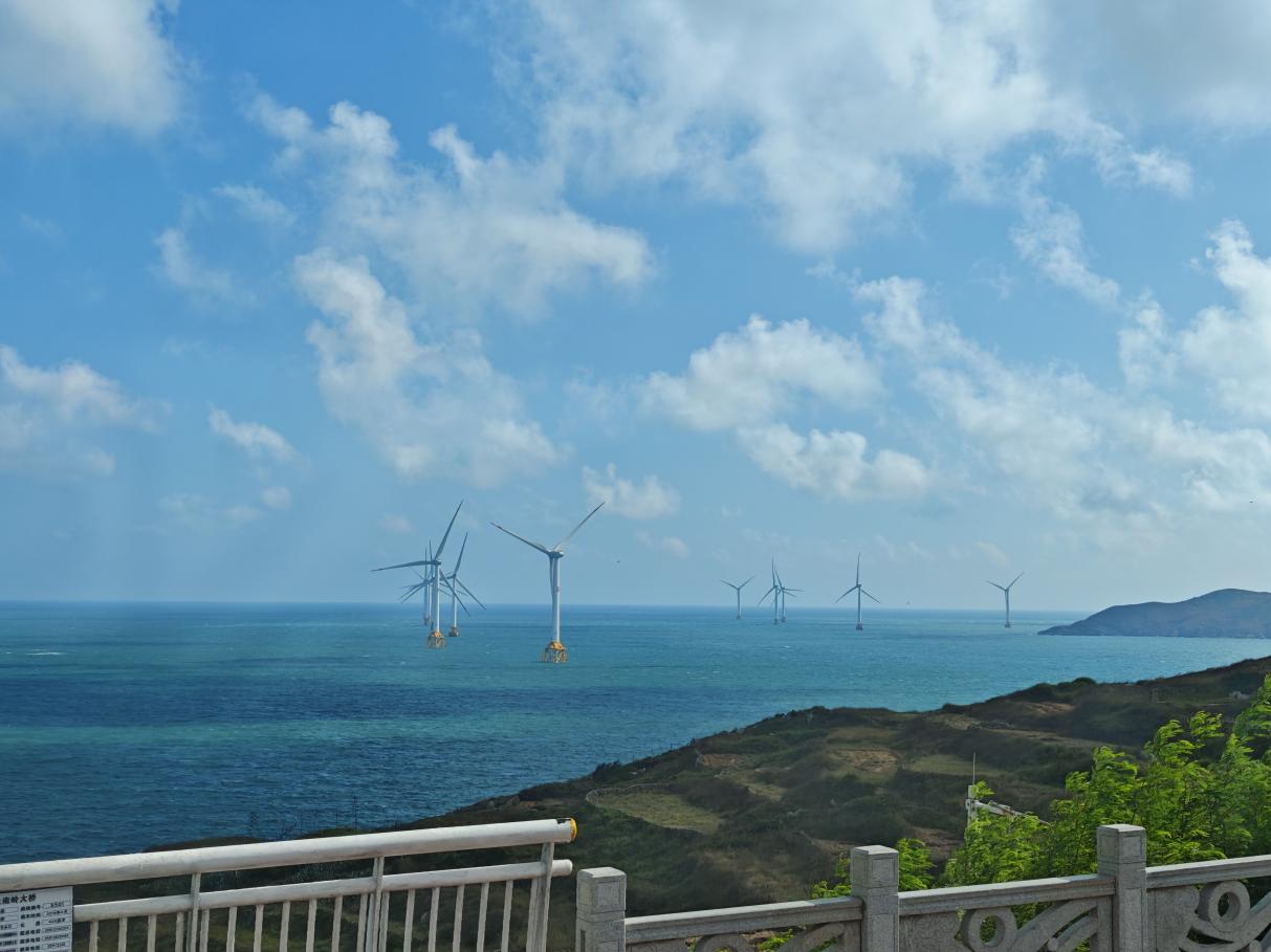 旅途首站,抵达长江澳风车田。数十座巨型白色风车,像列阵的忠诚卫士,稳稳屹立在连绵山丘与金色沙滩之间。海风拂过,巨大的叶片缓缓转动,带着低沉而有力的呼啸,在天地间划出优美弧线。作为福建的大型风电场,这里不仅是平潭独特的地标,更让旋转的机械韵律与壮阔的自然景观,在此刻达成了完美交融。