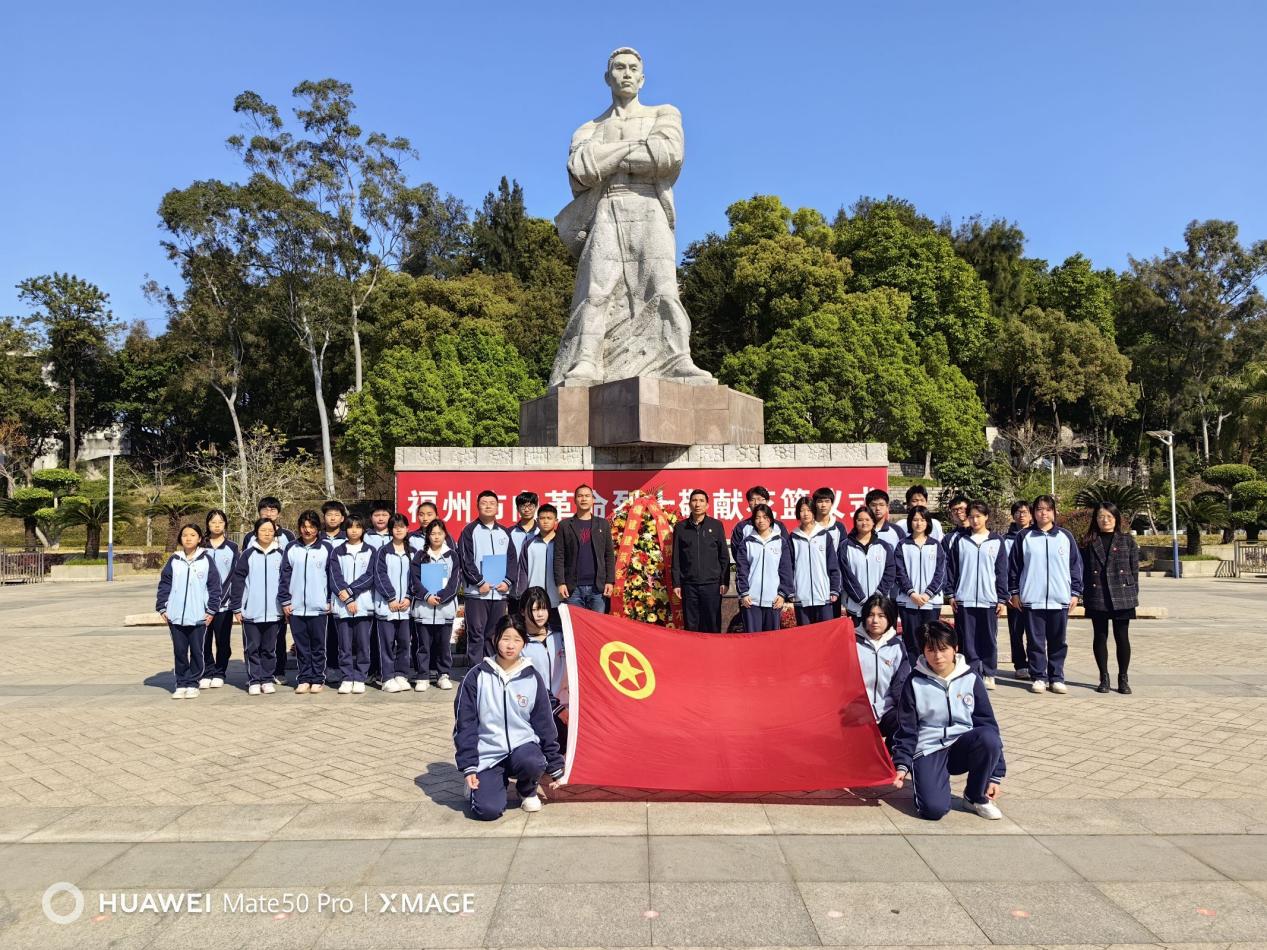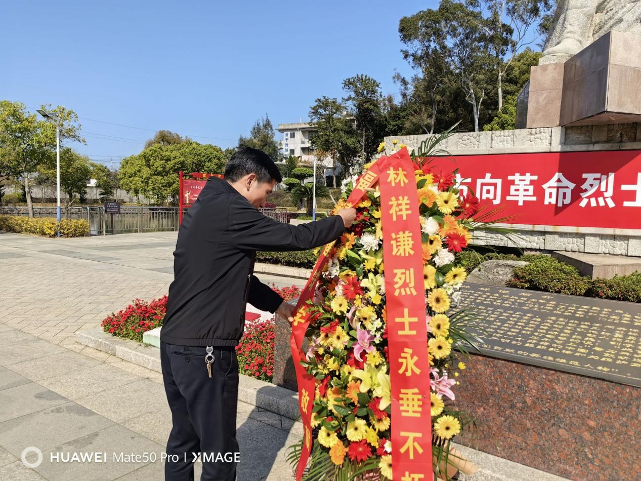 陵园广场,松柏苍翠,烈士塑像巍峨矗立。师生列队肃立,在庄重的乐曲声中向林祥谦烈士敬献花篮。林修财副校长缓步上前,郑重整理挽联,红绸墨字在春风中轻扬,镌刻着对先烈的深切追思。