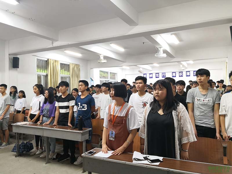 宣誓仪式在齐唱团歌中拉开序幕,团委副书记陈丹华首先表达了对各位新团员的祝贺与期望,鼓励新团员们牢记自身责任,严格要求自己,用实际行动表明自己无愧于“团员”这个光荣称号,并宣布了新团员名单。在新团员代表发言后,由两委干部老团员给新团员佩戴团徽,颁发团员证,全体新团员,在团委老师的带领下,庄重宣誓。
