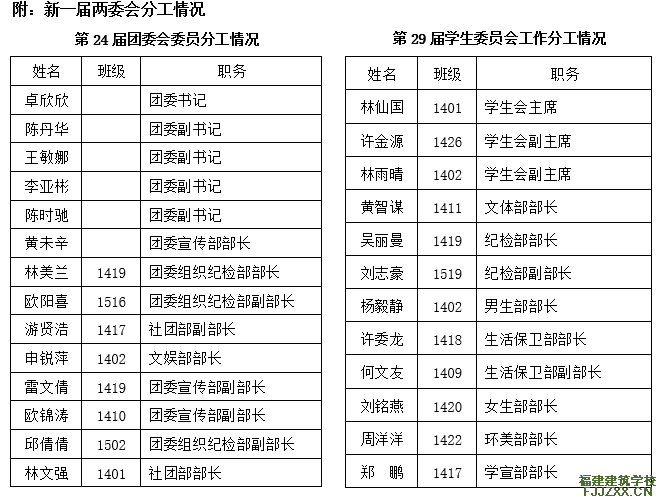 会议分别审议通过了《共青团福建建筑学校第二十三届委员会工作报告》、《福建建筑学校第二十八届学生委员会工作报告》。校团委副书记卓欣欣同志在报告中说,三年来,我校团委深入开展思想政治教育工作,在上级团组织的关心和指导下,在学校党委的直接领导下,在全体教工、团干和团员的支持和努力下,紧紧围绕学校的中心工作,充分发挥团委、学生会“自我教育、自我管理、自我服务”的工作职能,坚持为全校师生服务的宗旨,不断加强组织建设和学生干部队伍建设,在学风建设、问题活动、志愿服务和社会实践等方面都取得了长足的进步。