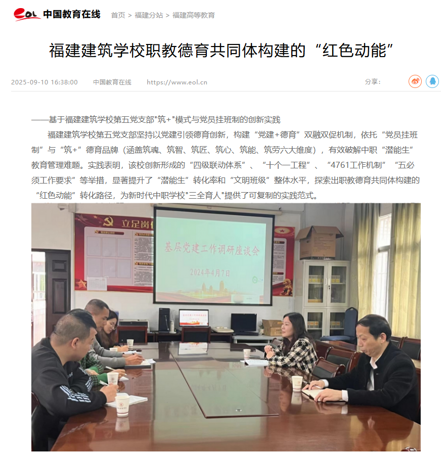 据悉,第五党支部在校党委领导下,持续推动党建与业务融合,依托“党员挂班制”和“筑+”德育品牌,聚焦党建+优秀学生榜样示范、“潜能生”关爱帮扶、德育队伍发展、大数据新媒体等创新驱动,助推学生工作高质量内涵式发展。撰写的《福建建筑学校职教德育共同体构建的“红色动能”》被《中国教育在线》全文刊发。