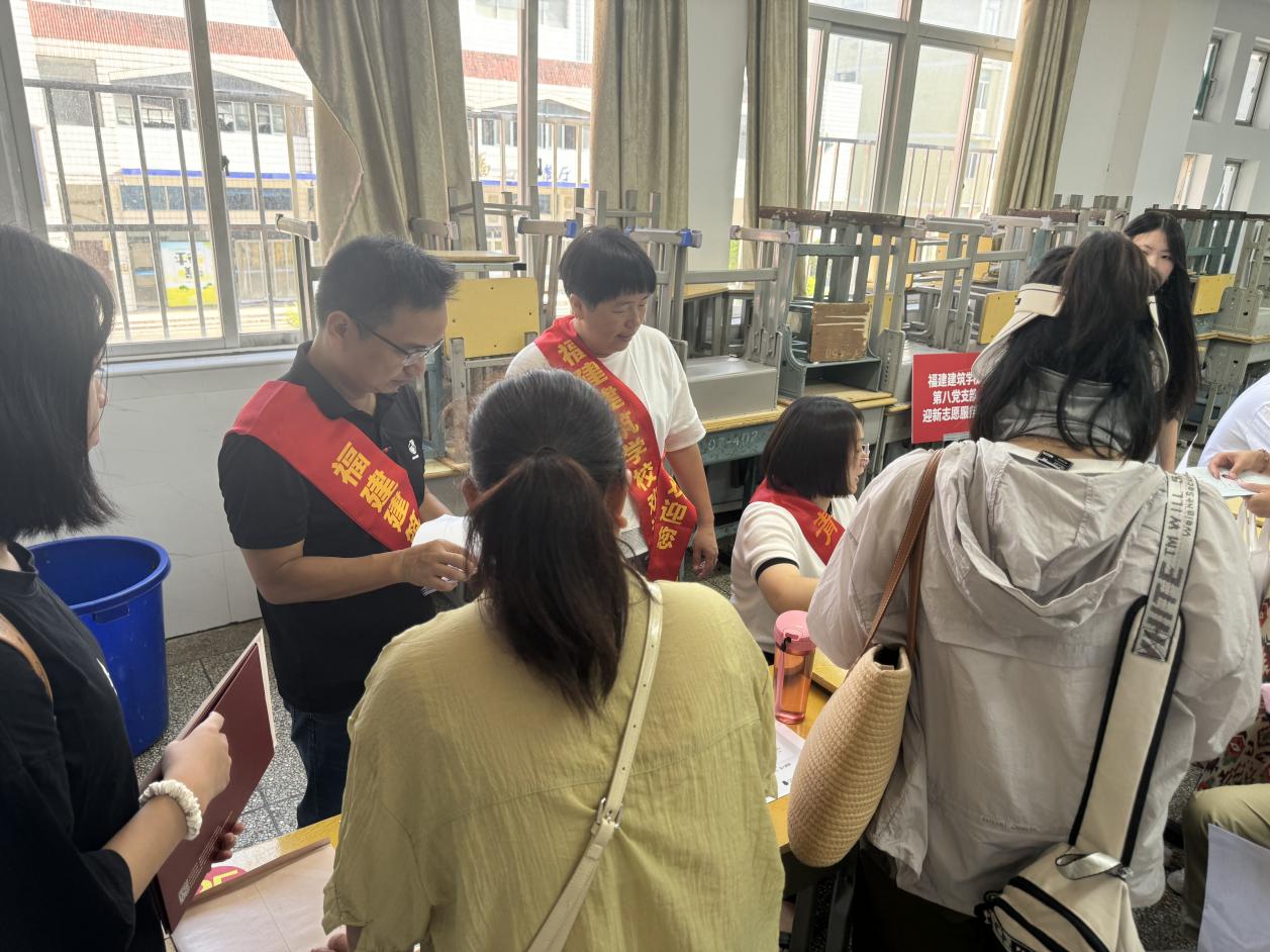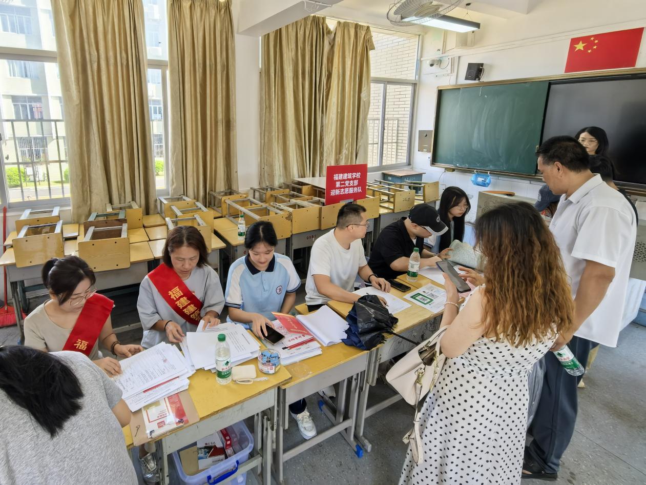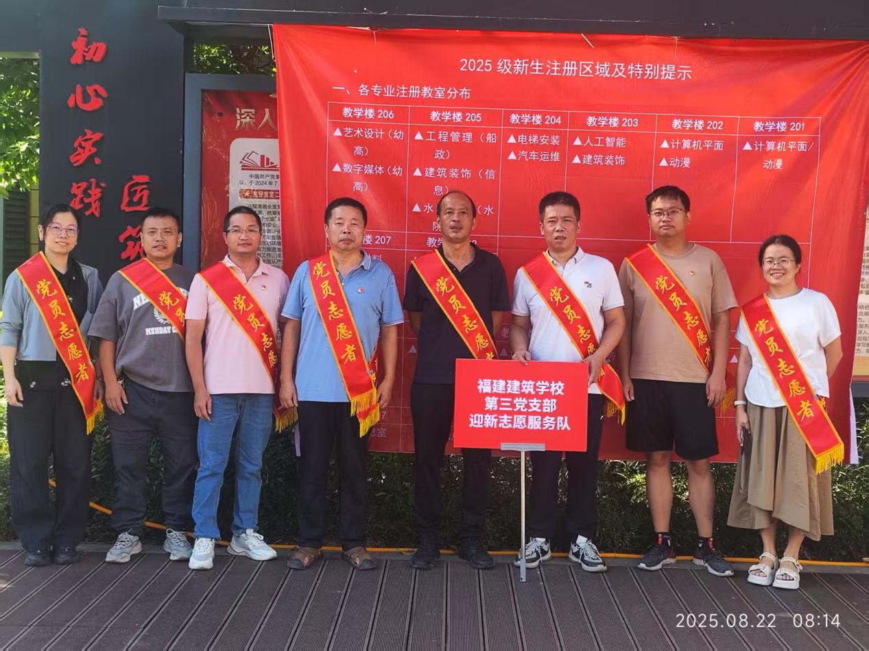 秋日晴空,暖阳正好。8月22日,福建建筑学校迎来了2025级新生报到的重要日子。为确保新生顺利入学、快速适应校园环境,校党委提前部署,组织各支部党员志愿者,统一佩戴党员徽章、身披绶带,深入迎新一线,在校门口、教学楼、宿舍楼、电梯口等关键位置摆摊设点,开展新生指引、注册报到、住宿安排等工作,为新生及家长提供“全方位、零距离”的暖心服务。