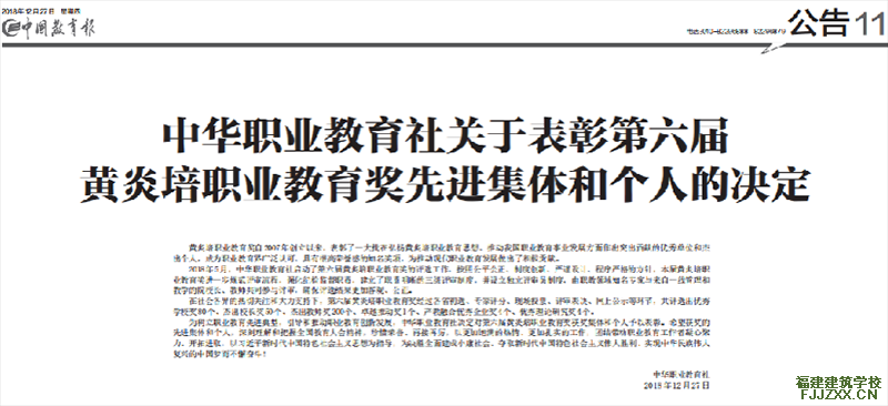 2018年12月28日,在全国上下认真学习贯彻全国教育大会精神之际,由中华职业教育社举办的第六届黄炎培职业教育奖颁奖大会在北京隆重举行。一批在弘扬黄炎培职业教育思想、推动我国职业教育事业做出突出贡献的优秀单位和杰出个人受到表彰奖励。