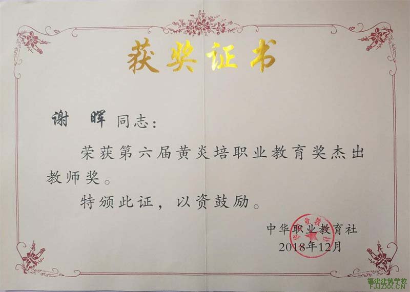 (一)2018年12月,谢晖同志荣获第六届黄炎培职业教育奖杰出教师奖