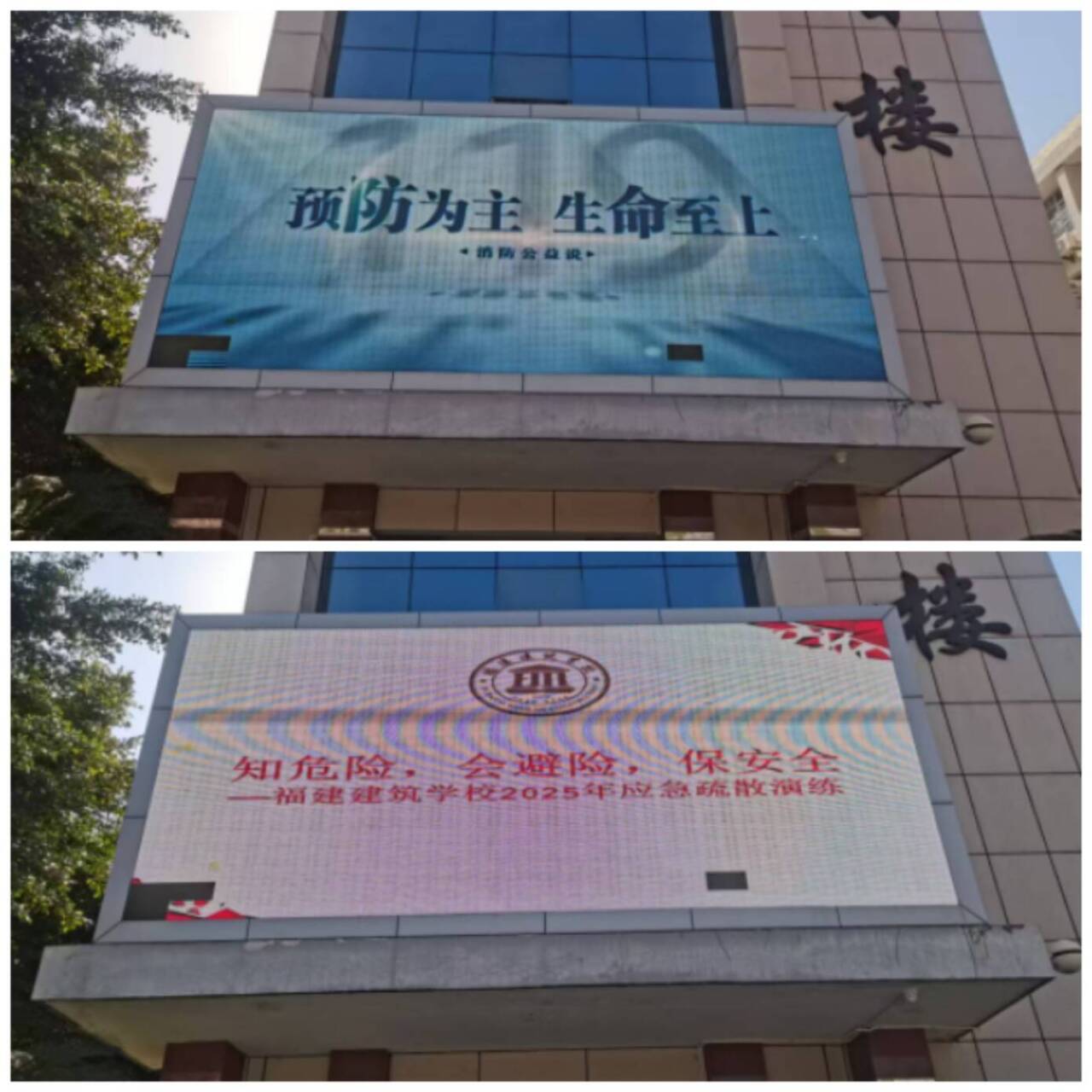 学校通过沉浸式安全宣导营造全员参与氛围:LED电子大屏全天候滚动播放消防公益宣传片,教学楼道、食堂、宿舍等区域张贴标准化疏散示意图,班级黑板报开辟安全知识专栏。通过“视觉全覆盖+知识场景化”模式,让安全种子深植师生心间。