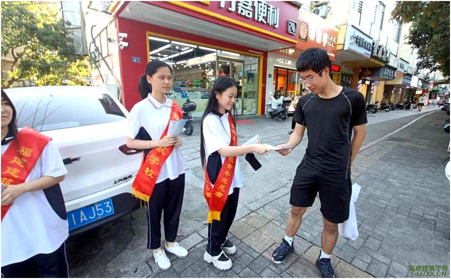 福建建筑学校团委志愿者和劳光村关工委党员志愿者发放禁毒宣传册