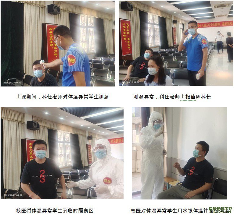 宿舍管理人员在宿舍发现学生体温异常,立即将该学生带到临时观察室,并通知校医。校医做体温复检后,发现学生体温异常,上报值周科长,将学生送医,并通知总务科安派人员对该宿舍进行消杀。