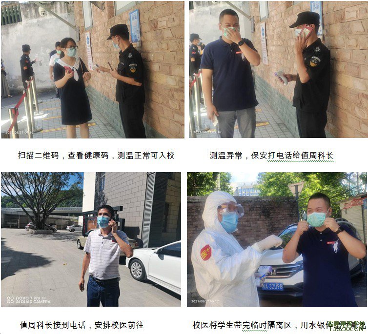 校门是校园防疫的第一道关口。学生(班主任扮演)在规定时间段到校,并在指定区域等候(前后左右间距1米)。学生进校前,必须戴好口罩,扫描二维码,出示健康码,接受体温检测,发现体温异常时,保安立即打电话给值周科长。值周科长安排校医前往,将学生带到临时隔离区,用水银体温计测量体温,体温正常时,方可入校,若体温异常,则上报值周科长,由值周科长协调专车送学生前往医院,并通知总务科安排人员对临时隔离区进行消杀。