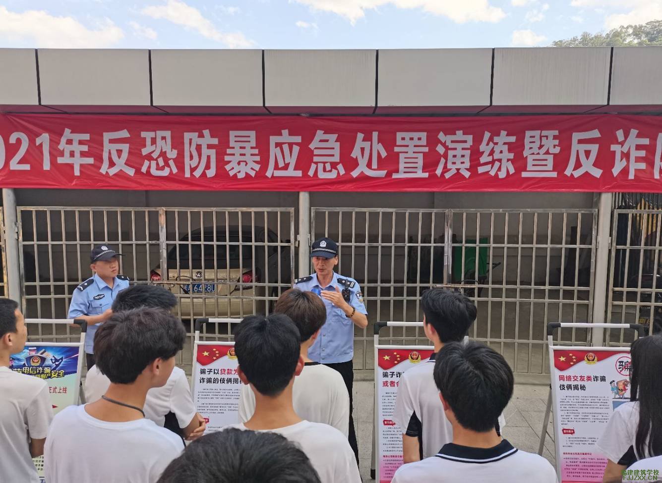 为有效规避和防范校园恐怖暴力发生的风险,提高师生应急处置意识和能力,确保在突发紧急伤害事件发生时,能快速有效给予应急处置,全力保障师生生命财产安全,以建设更高水平“平安福建”为总体要求,努力实现5A级新一轮“平安校园”的创建目标。5月26日下午,我校邀请福州市公安局建新派出所一同开展反恐防暴应急处置演练。建新派出所、学生保卫科、福建鹭鹭安保安服务有限公司及各班学生代表近160人参加。