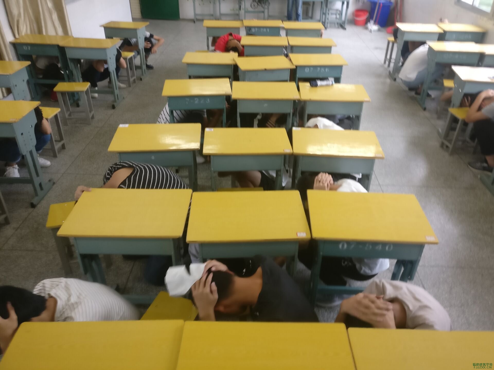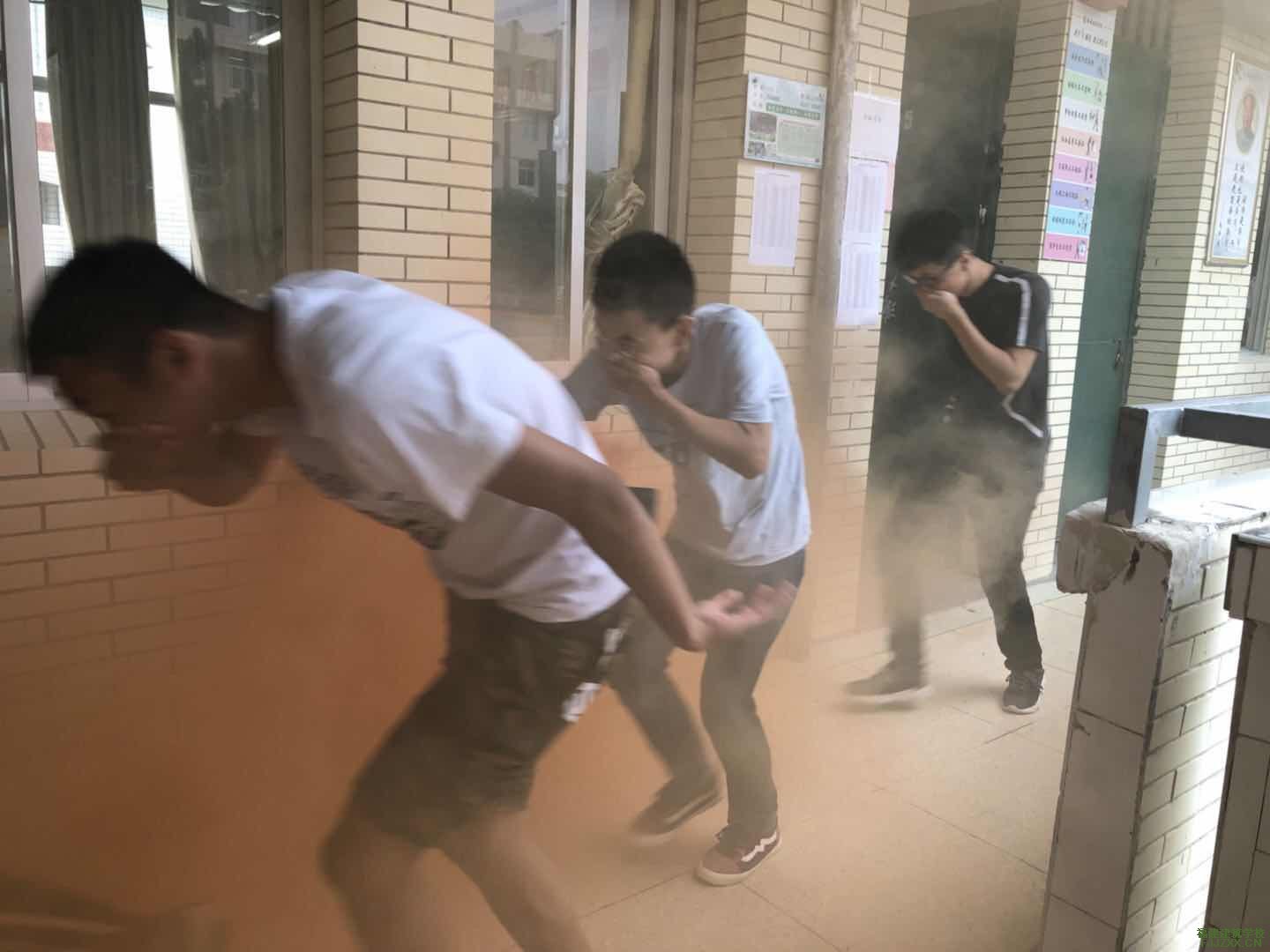 当天中午12:30分,当地震警报一响起,同学们在班主任的指挥下井然有序地利用课桌、书本有效地进行自护,双手抱头,做好地震避险的防护。并按照指定路线进行快速疏散,同学们弯着腰,用毛巾捂住口鼻,快速撤离到校活动中心的安全地带,随即各班主任清点人数,并层层向上汇报。集合完毕后,校保安队长亲自给同学们示范了如何使用干粉灭火器,并叮嘱大家遇到紧急事件要沉着冷静。
