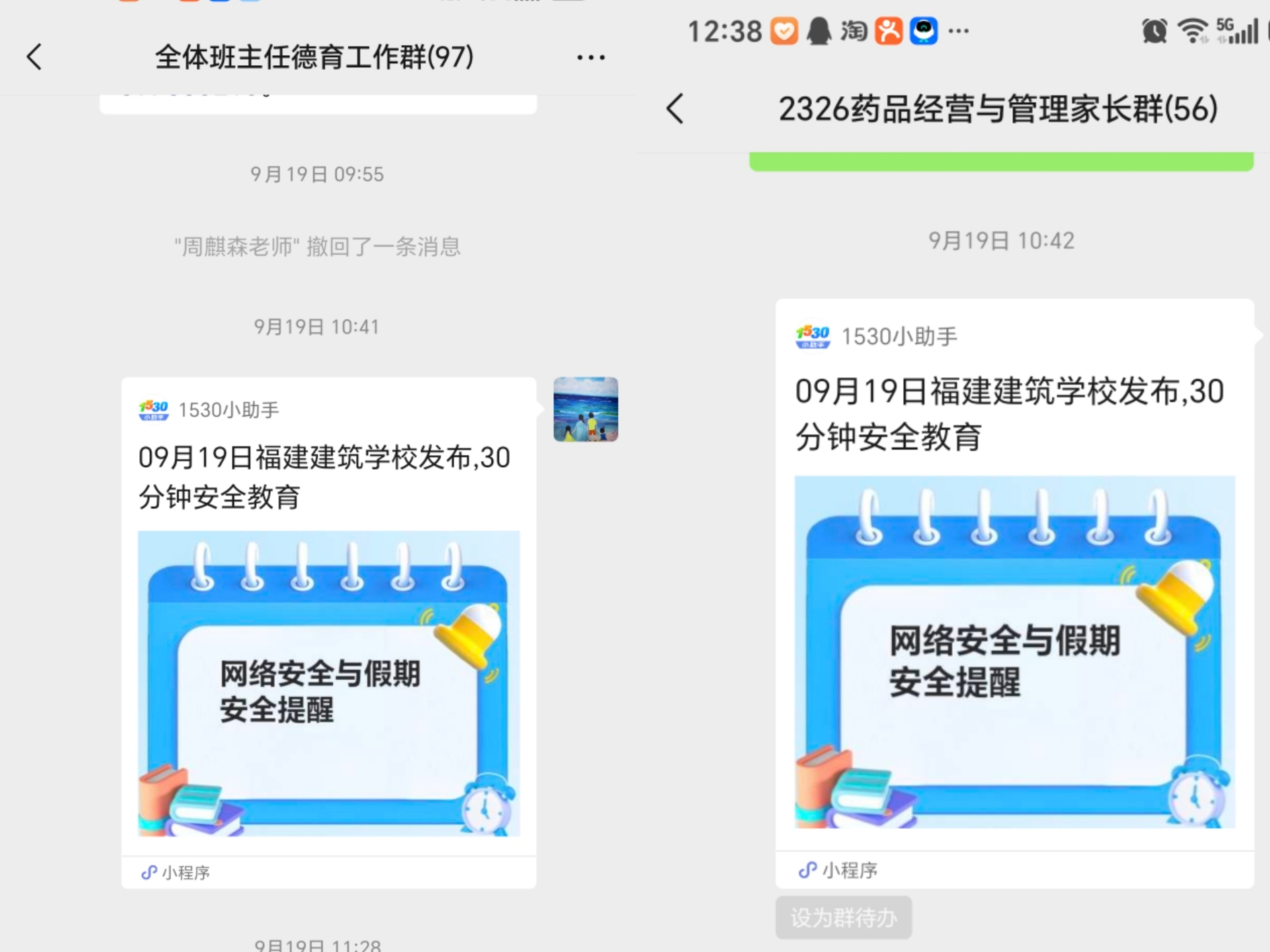 为打破安全教育的校园边界,形成“家校协同”防护合力,学校依托“1530”安全教育小程序,向各班级家长群精准推送网络安全教育资源。推送内容兼具实用性与针对性,还附带网络安全科普视频,方便家长利用碎片化时间学习。这一举措让家长清晰了解网络安全宣传周的意义,也为家长引导孩子安全用网提供了具体方法,真正实现“学校教、家庭帮”的联动教育效果,共同为学生营造安全的网络成长环境。