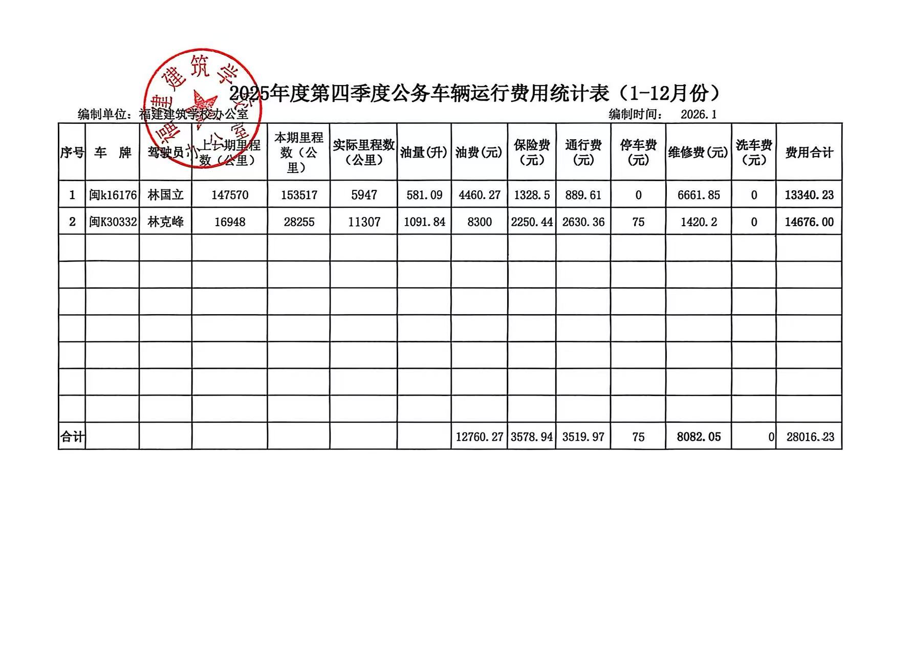 2025年度第四季度公务车辆运行费用统计表(1-12月)
