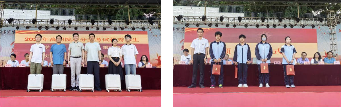 表彰先进,激励前行。大会特别设置表彰环节,叶扬校长、蔡文镇副校长为表现优异的师生颁发奖品并合影。