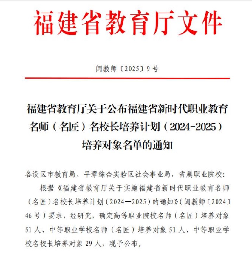 福建省新时代职业教育名师(名匠)名校长培养计划(2024-2025)由福建省教育厅组织实施,旨在全省范围内遴选一批师德高尚、技艺精湛、育人成效显著的职业教育一线骨干教师,全力打造新时代高素质的“双师型”教师队伍。我校将以此为契机,深化教育教学改革,号召全体教师以先进为标杆,以创新促发展,共同推动我校职业教育事业高质量发展!