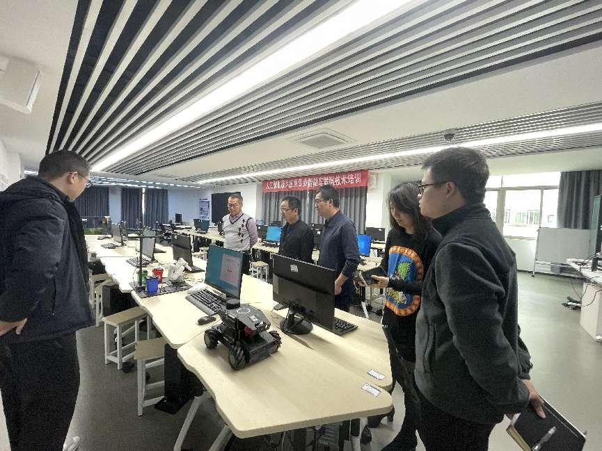 我校信息教学部主任肖能德对学院的热情接待表示感谢,并介绍了本校人工智能与技术应用专业的建设现状与发展规划,表示希望通过本次调研学习先进经验,重点在师资能力提升、课程体系重构、实训条件优化等方面寻求突破。双方围绕特色课程开发、“双师型”教师培养机制、1+X 证书制度实施路径等关键问题展开深入研讨。会后,调研组深入考察了杜园校区人工智能产品应用实训室、人工智能学习中心、车联网智慧交通实训室等教学实训场所,双方教师就课程思政融入、项目化教学实施等具体问题进行了深入交流。