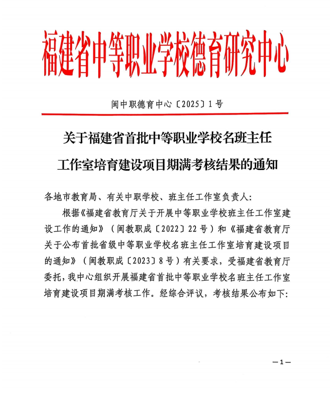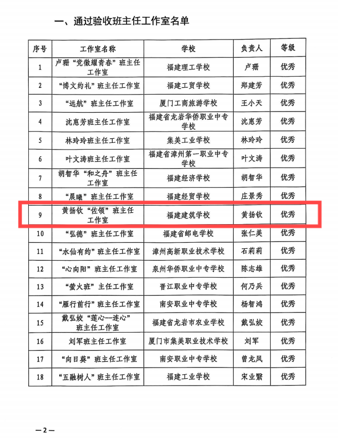 2025年1月10日,福建省中等职业学校德育研究中心下发了《关于福建省首批中等职业学校名班主任工作室培育建设项目期满考核结果的通知》(闽中职德育中心〔2025〕1号),我校黄扬钦“佐领”班主任工作室顺利通过验收,并被评定为优秀。
