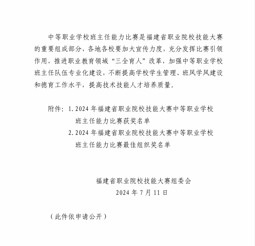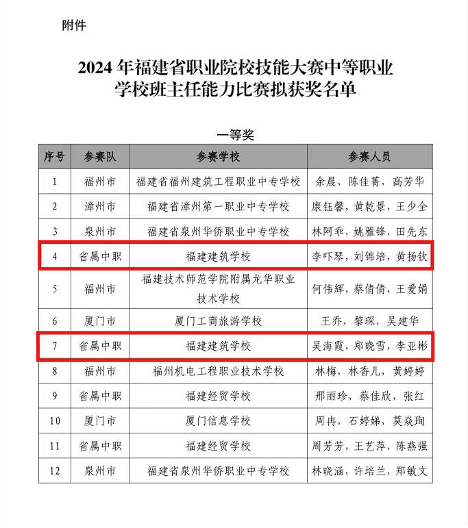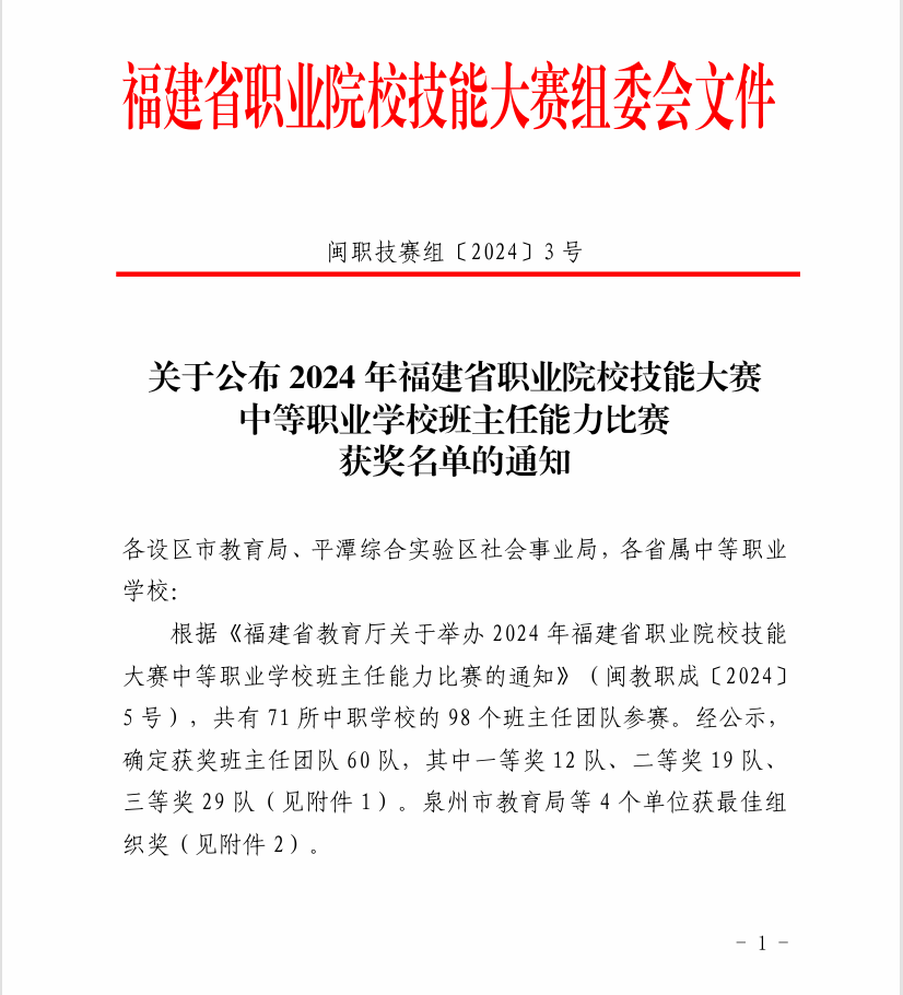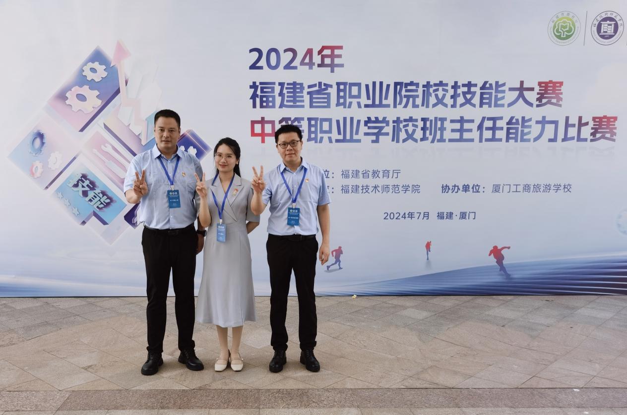 为贯彻落实立德树人根本任务,进一步推进“三全育人”改革和中等职业学校班主任队伍专业化建设,提高中职学校学生管理和德育工作水平,7月3日,由福建省教育厅主办的2024年福建省职业院校技能大赛,福建省中等职业学校班主任能力比赛现场决赛在厦门工商旅游学校落下帷幕。我校两支参赛团队(李吓琴、刘锦培、黄扬钦团队和吴海霞、郑晓雪、李亚彬团队)均以出色的表现获得省赛一等奖的优异成绩。