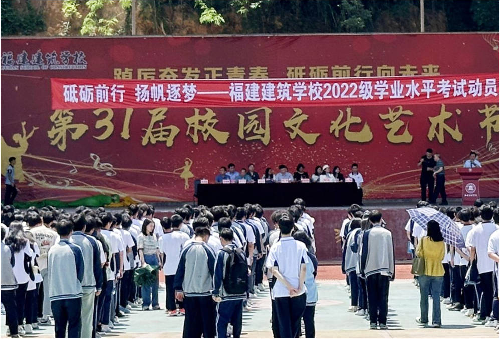 夏日和风破寒窗,建筑学子勇奋进。2024年5月11日下午,福建建筑学校2022级学业水平考试动员大会在校田径场隆重举行。叶扬校长、林国杰副校长以及各专业教学部主任、年段长、21级班主任代表、学生代表等参加大会。大会由教务科科长黄训贤主持。