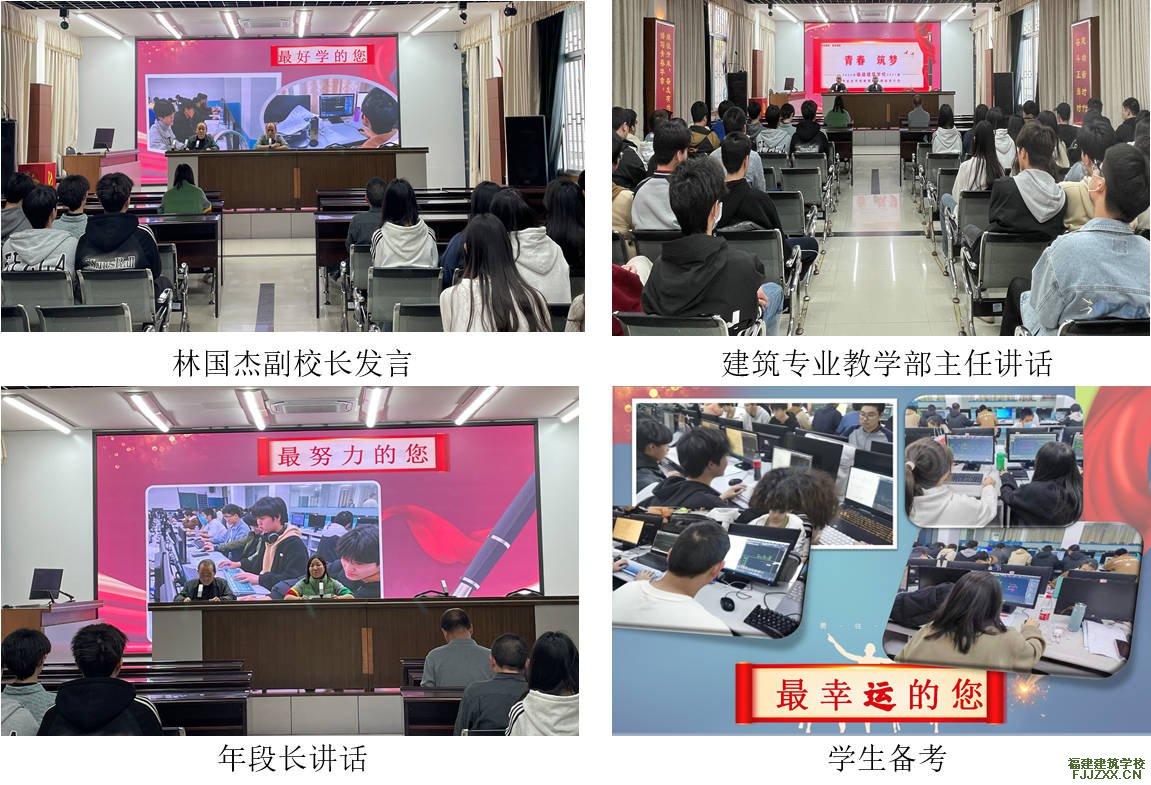 动员会上,建筑专业教学部主任和年段长对迎考准备、饮食交通安全、备考需知等事项进行了强调提醒。林国杰副校长进行动员讲话,表达了学校领导重视关心,鼓励学生积极备考,为学生加油,祝愿学生超水平发挥,心想事成,青春筑梦。最后,学生以热烈掌声对任课教师无私奉献和辛勤付出表达了感谢,并表示将全力以赴为梦想奋斗,让青春闪光。