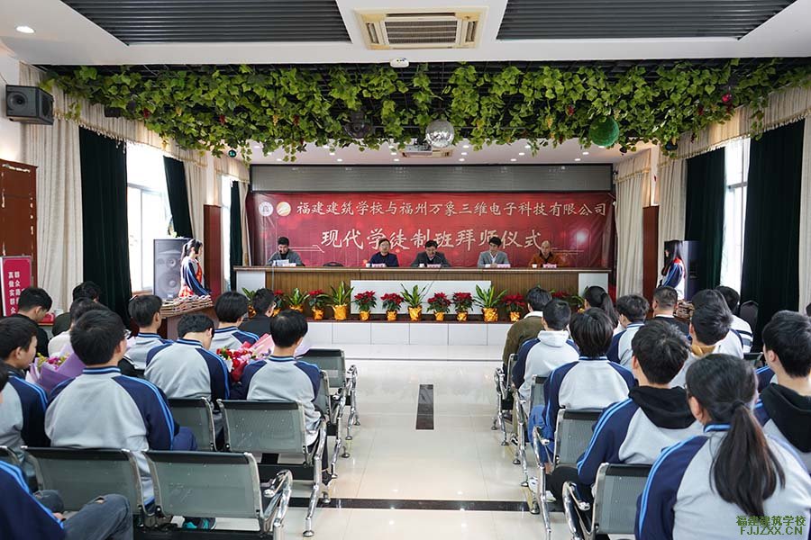 为进一步践行十九大报告中“完善职业教育和培训体系,深化产教融合、校企合作”,进一步深化学校教育教学改革,3月15日下午,我校计算机动漫与游戏专业现代学徒制试点拜师仪式在学校多功能厅隆重举行。学校副校长许育龙、环境与艺术设计教学部部分教师,福州万象三维科技有限公司总经理张细明、副总经理戴少海及企业导师,第四批现代学徒制班全体学员参加了开班仪式。
