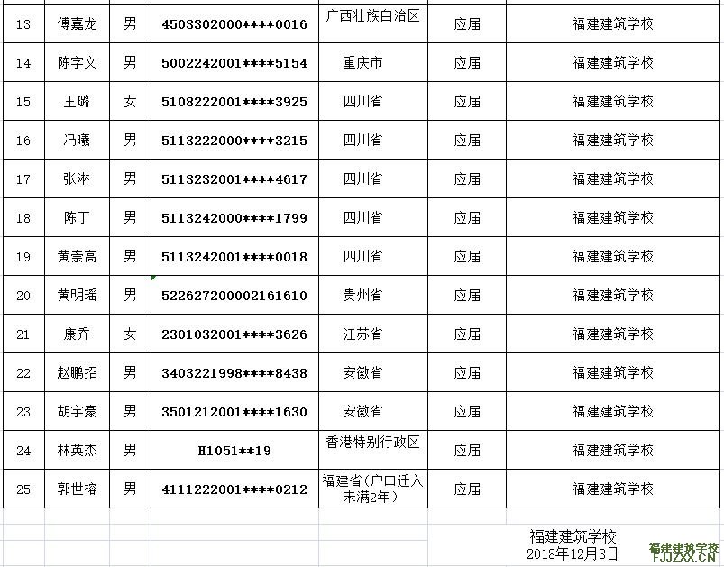 福建建筑学校2019年福建省高职招考随迁子女身份信息公示一览表