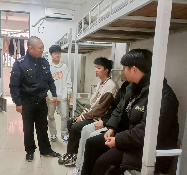走访期间,黄锋警官与班主任详细了解同学们的住宿生活、学习作息及人际交往情况,与大家亲切交流、倾听诉求,叮嘱学生合理安排作息、遇到困难及时沟通,一句句关怀让宿舍充满温情。黄锋警官还围绕防欺凌、防诈骗、宿舍用电安全等内容开展法治安全教育,引导学生增强法治观念和自我防护意识;班主任则重点关注学生心理状态与生活需求,鼓励同学互助友爱,携手共建温馨和谐的宿舍家园。