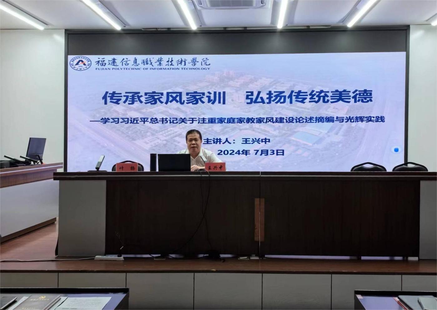 家风连着党风,家廉才能政廉。为进一步巩固学校党纪学习教育成果,全面加强师德师风建设,传承清正廉洁家风,弘扬中华优秀传统美德,我校于7月3日上午特邀福建信息职业技术学院党委副书记王兴中为全体教师开设《传承家风家训 弘扬传统美德——学习习近平总书记关于注重家庭家教家风建设论述摘编与光辉实践 》专题讲座。