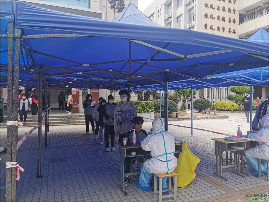 检测工作过程中,校领导深入一线进行督导,切实保障了组织有序规范,检测不漏一人。由校第三党支部、第四党支部组成的党员志愿服务工作组全程在检测现场进行线路引导和秩序维护工作,工作人员各司其职,有条不紊地登记信息、采集样本。受检人员十人一组,严格保持1米间距,依次入场,有序离场。
