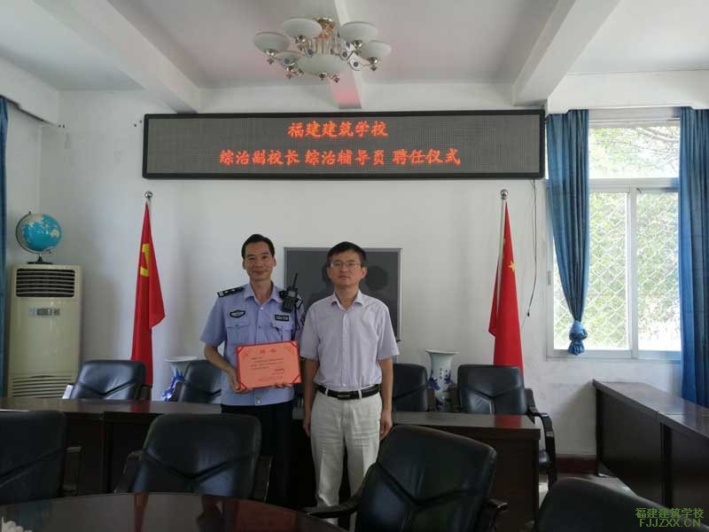 2016年9月6日,福建建筑学校在校会议室举行综治副校长、综治辅导员聘任仪式,许育龙副校长,学生科黄训贤科长参加此次仪式。仪式上,许付校长代表学校向建新派出所副所长齐忠锦以及建新派出所段警唐继明颁发聘书,正式聘任两位为我校综治副校长以及综治辅导员。