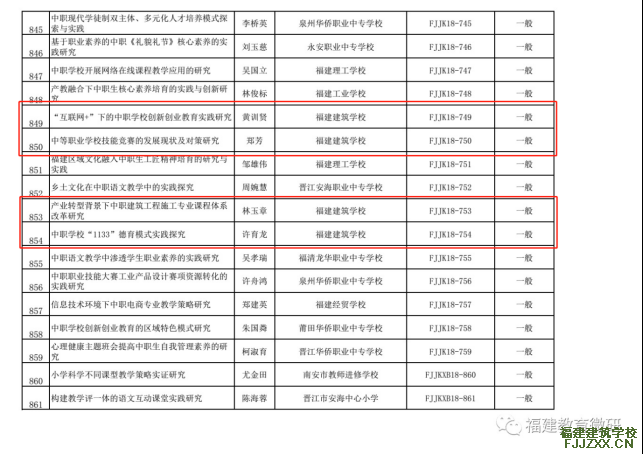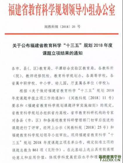 根据《关于做好福建省教育科学“十三五”规划2018年度课题申报立项工作的通知》(闽教科规〔2018〕11号)要求,我校积极组织教师开展课题研究和课题申报工作,其中郑芳同志负责的课题《中等职业学校技能竞赛的发展现状及对策研究》(立项批准号:FJJK18-750)、许育龙同志负责的课题《中职学校“1133”德育模式实践探究》(立项批准号:FJJK18-754)、黄训贤同志负责的课题《“互联网+”下的中职学校创新创业教育实践研究》(立项批准号:FJJK18-749)、林玉章同志负责的课题《产业转型背景下中职建筑工程施工专业课程体系改革研究》(立项批准号:FJJK18-753)顺利通过专家评审和网络公示,经福建教育科学规划领导小组审批,确定批准立项。
