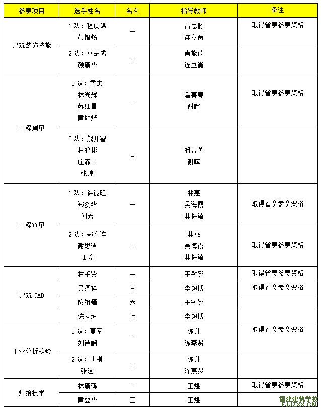 我校选手所参加的建筑装饰技能、工程测量、工程算量、建筑CAD、工业分析检验、焊接技术以及建筑设备安装与调控(给排水)、电梯维修保养等八个项目全部取得省赛参赛资格。