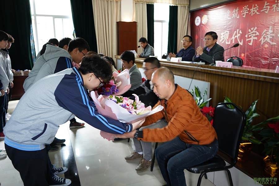 最后,学校领导向企业师傅颁发聘书、学徒向师傅奉茶、献花、鞠躬行拜师礼,签订拜师贴与回徒贴,师傅向徒弟赠送信物,师徒同台合影。