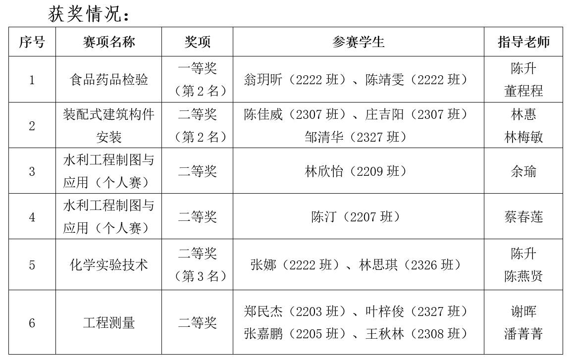 2025年度福建省职业院校技能大赛(中职组)于2025年3月-4月在福建省各赛点成功举行,我校作为福建省属学校各赛项的代表队参加装配式建筑构件安装、水利工程制图与应用、工程测量、食品药品检验、化学实验技术等5个项目的比赛,经过选手们的团结协作、奋力拼搏,喜获一等奖1项、二等奖5项的优异成绩。其中食品药品检验、装配式建筑构件安装两个赛项晋级国赛。在此,对获奖的选手和指导老师表示热烈的祝贺,希望进入国赛的师生再接再厉,再创佳绩!