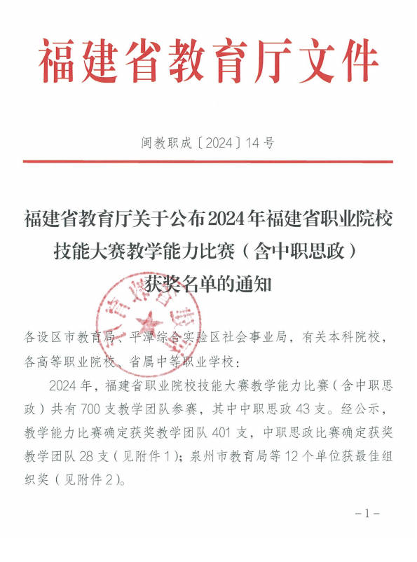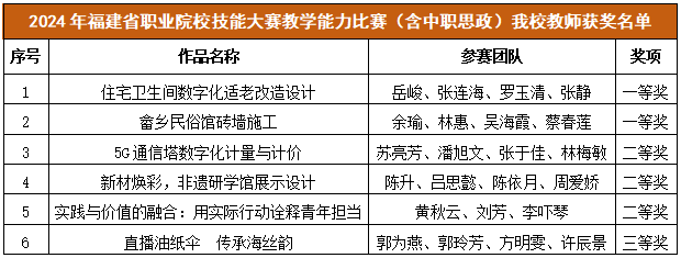 根据《福建省教育厅关于公布2024年福建省职业院校技能大赛教学能力比赛(含中职思政)获奖名单的通知》(闽教职成〔2024〕14号),2024年共有700支教学团队参赛,其中中职思政43支。经公示,教学能力比赛确定获奖教学团队401支,中职思政比赛确定获奖教学团队28支。我校6支参赛团队发挥出色,经过层层选拔、激烈角逐,获得一等奖2项、二等奖3项,三等奖1项的优异成绩。