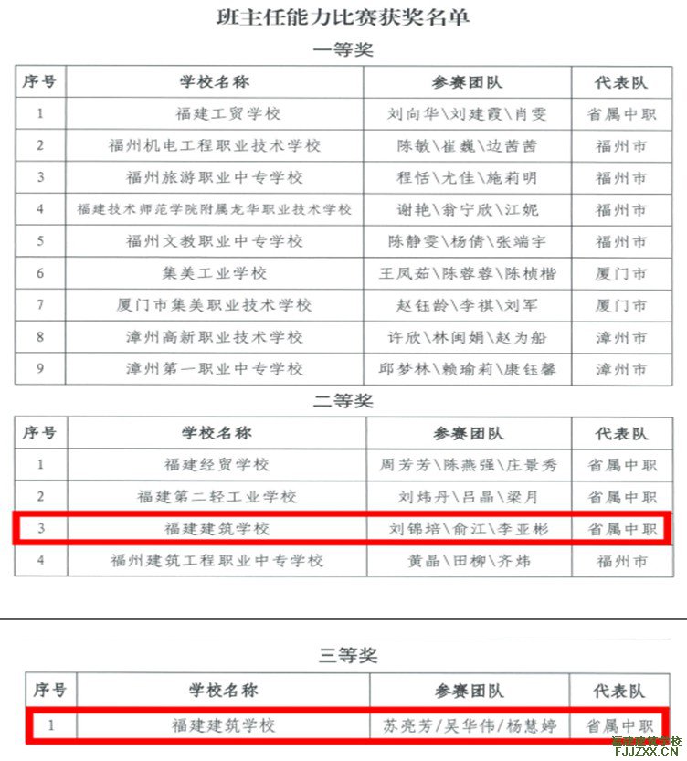 在刚刚结束的省教育厅举办的2023年福建省职业院校技能大赛中等职业学校班主任能力比赛上,我校刘锦培、俞江、李亚彬和苏亮芳、吴华伟、杨慧婷6位老师组成两支参赛代表队经过校赛、省属赛、省赛,层层选拔,力拔头筹,分别获得省中等职业学校班主任能力比赛二等奖和三等奖的好成绩,特此祝贺!