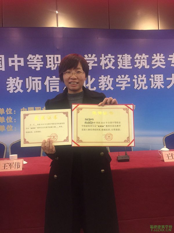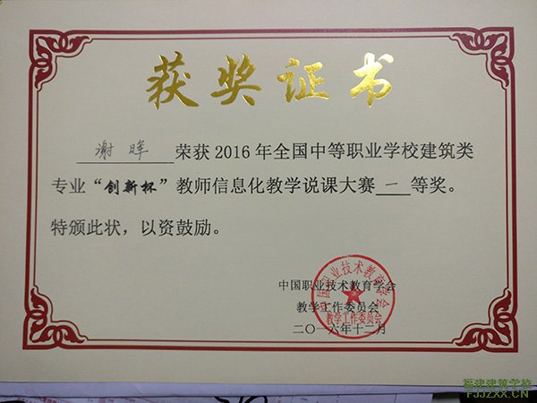 福建建筑学校土木工程教学部谢晖、张连海俩位老师于2016年12月代表福建省参加在成都举办的2016年全国“创新杯”信息化说课大赛。通过精心准备、努力钻研、积极拼搏,最终谢晖老师获得全国一等奖、张连海老师获得全国二等奖的优异成绩。谢晖老师并作为福建省的领队代表福建省职业技术教育中心领取了最佳组织奖。