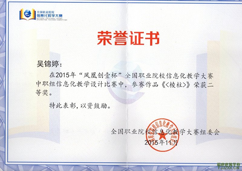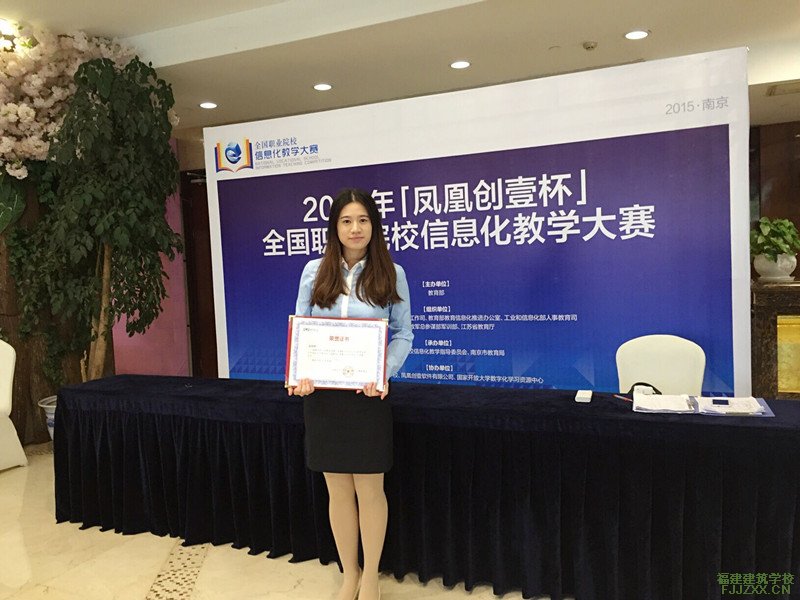 2015年11月7日——11月9日,由教育部主办、教育部职业院校信息化教学指导委员会承办的2015年全国职业院校信息化教学大赛决赛在南京举行。我校吴锦婷老师代表福建省参赛,在竞赛中取得优异的成绩,作品《棱柱》荣获中职组信息化教学设计比赛全国二等奖。