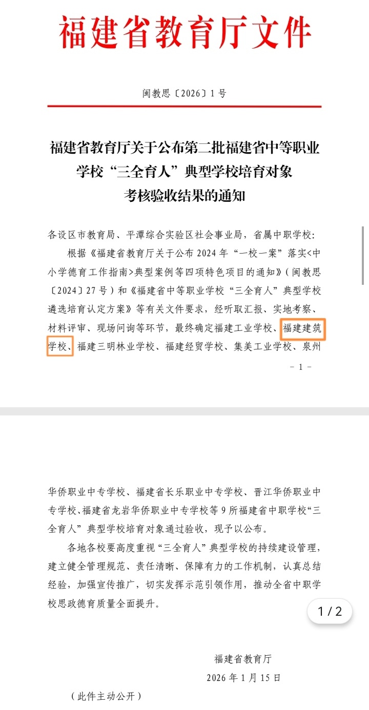 近日,福建省教育厅公布第二批福建省中等职业学校“三全育人”典型学校培育对象考核验收结果,福建建筑学校顺利通过验收。
