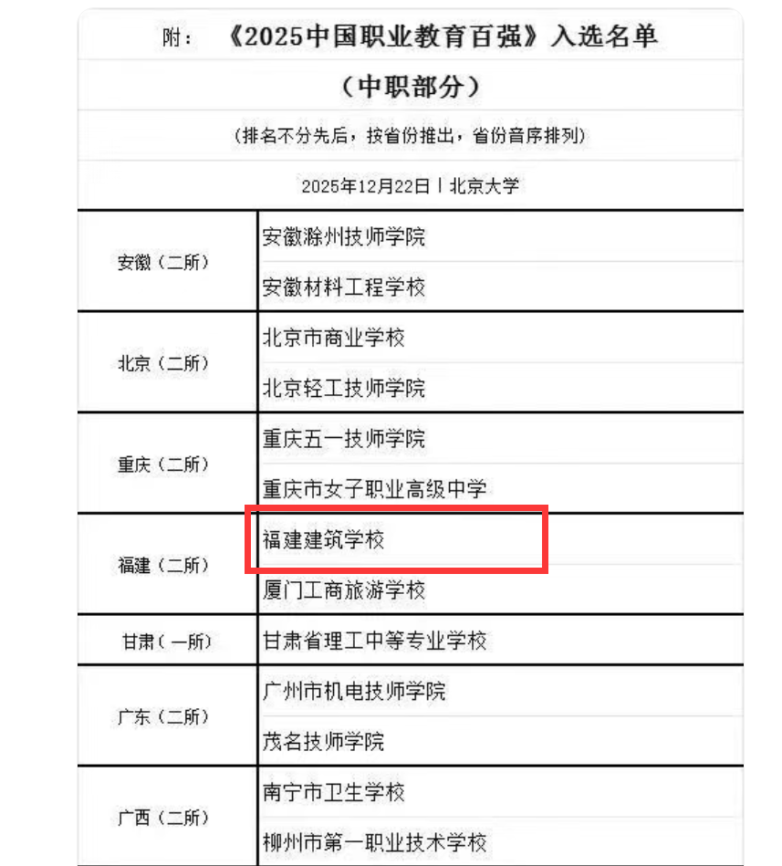 2025年12月22日-23日,第九届《中国职业教育百强》发布会在北京大学隆重举行,活动同期发布《2025中国中职50强》榜单,福建建筑学校成功入选,成为福建省内获此殊荣的两所中职院校之一。