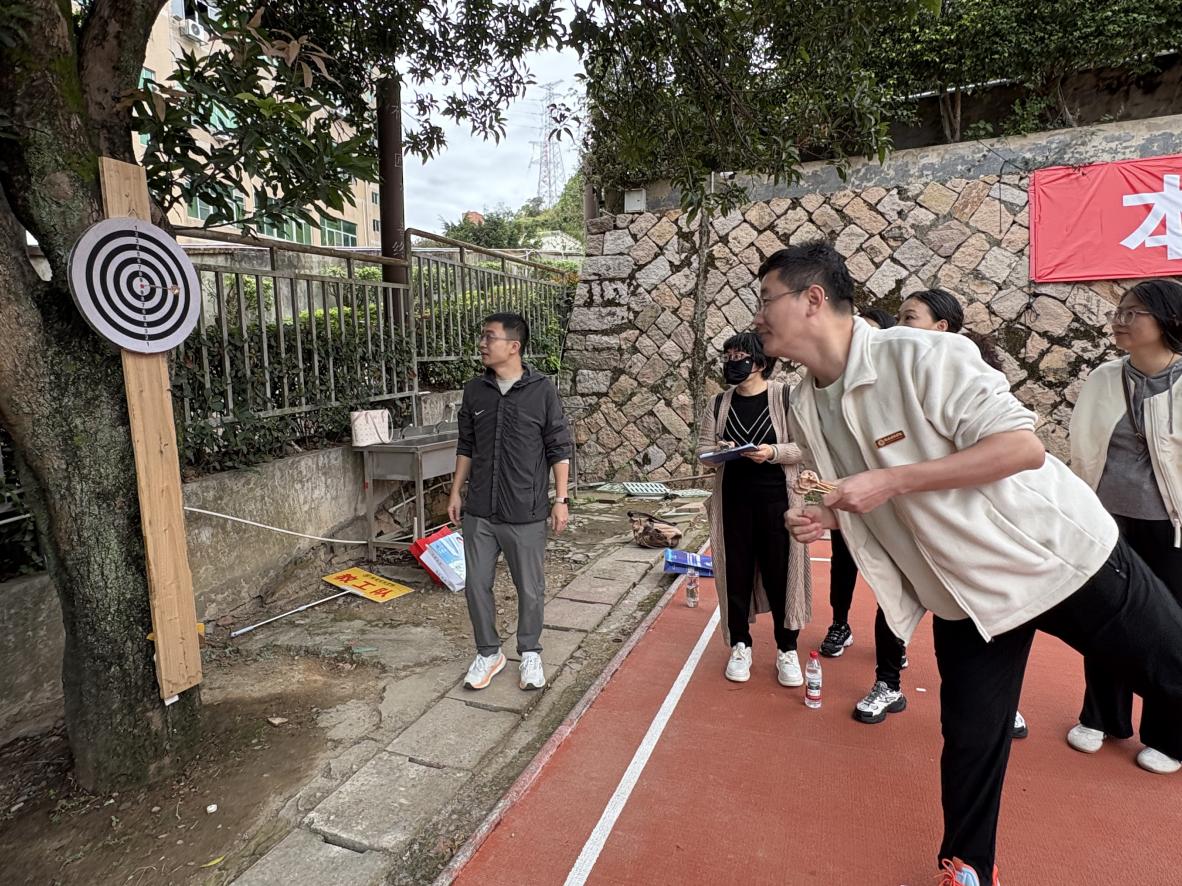 飞镖比赛现场,老师们凝神静气,瞄准靶心,手中飞镖划出一道道优美的弧线,引来阵阵喝彩。