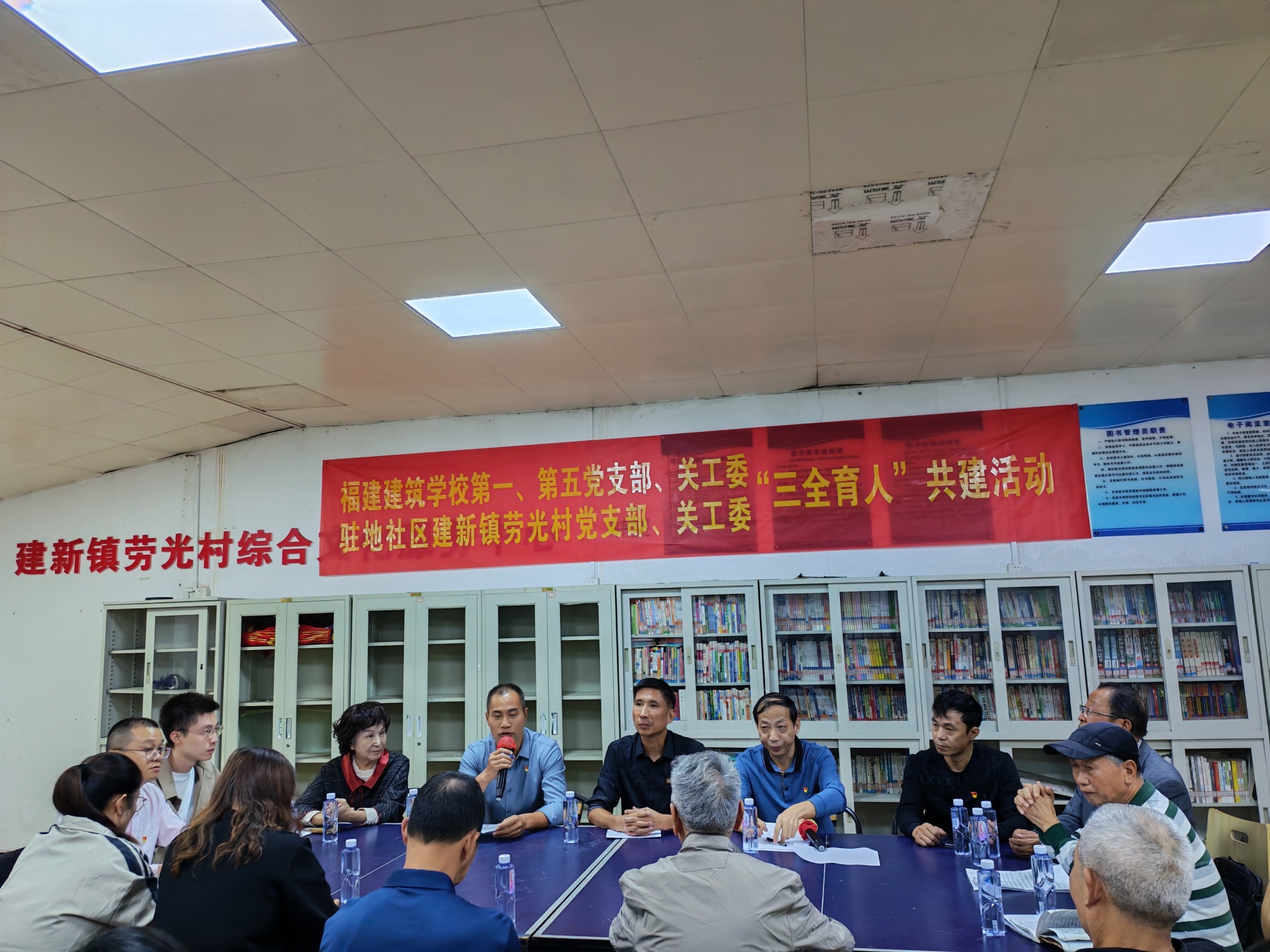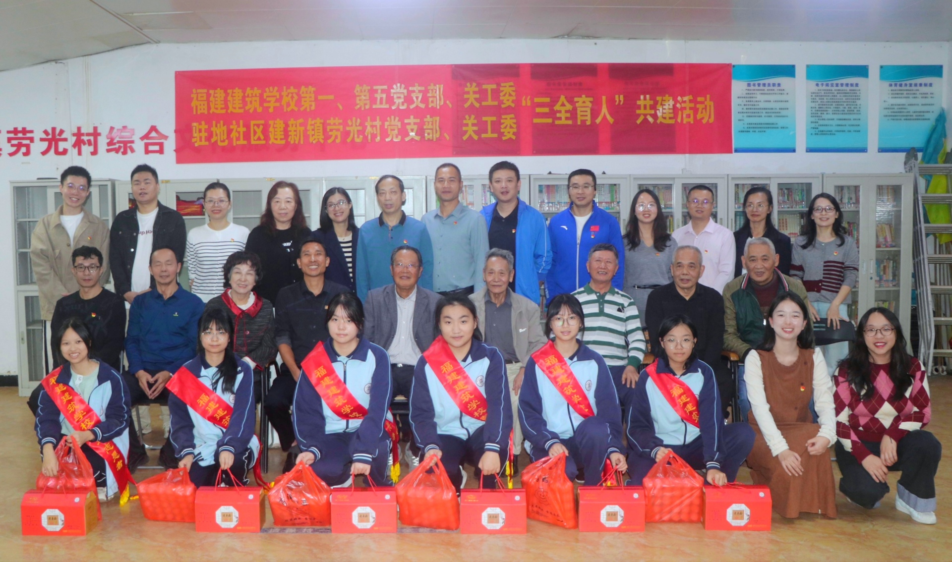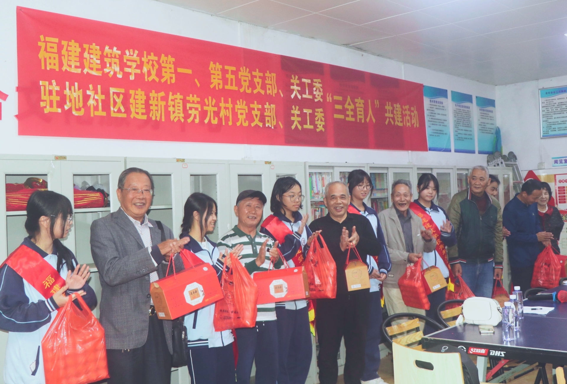 为深入贯彻党的二十届四中全会精神,大力弘扬孝亲敬老的中华传统美德,深化校社协同育人实践,10月29日下午,福建建筑学校第一党支部、第五党支部、关工委与驻地社区建新镇劳光村党支部、关工委在劳光村老人活动室联合举办“重阳敬老践初心,三全育人谱新篇”共建主题党日活动。劳光村党支部代表,关工委成员,退休老同志,福建建筑学校第一、第五党支部党员,关工委成员以及学生代表等近40人参加活动,活动由福建建筑学校第一党支部书记丘永发主持。