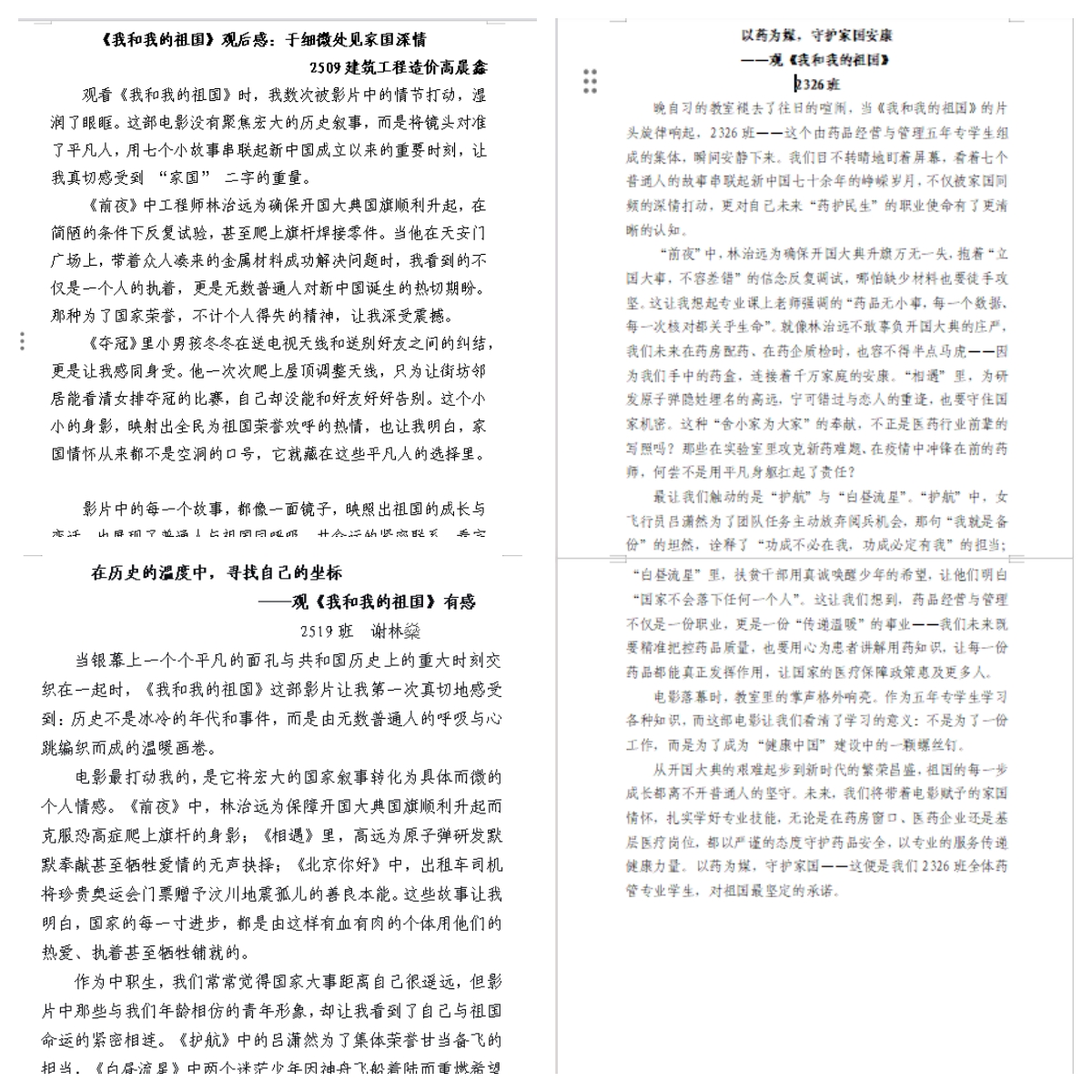 “从开国大典到航天圆梦,每一个瞬间都让人热泪盈眶!”国庆前,各班级陆续组织观看影片《我和我的祖国》,学子们通过文字记录下对历史瞬间的震撼、对祖国成就的自豪,更写下“吾辈当自强”的青春誓言,字里行间满是与祖国共成长的坚定信念。